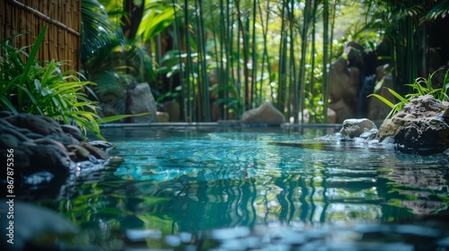 A serene pool in a spa setting, surrounded by bamboo and natural stone
