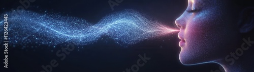 A serene profile of a person exhaling vibrant, glowing particles, symbolizing breath and energy in a dark, mystical atmosphere.