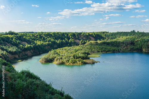 A serene river winding through lush green forested hills under a bright blue sky with scattered clouds, showcasing peaceful nature and vibrant landscapes.