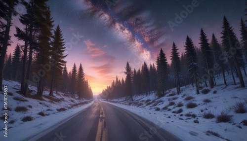 A serene road winds through snow-dusted woods towards a colorful morning sky with stars in the Milky Way, mountain, landscape