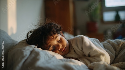 A serene scene of a young child asleep in bed during golden hour, capturing warmth and tranquility in a cozy room.