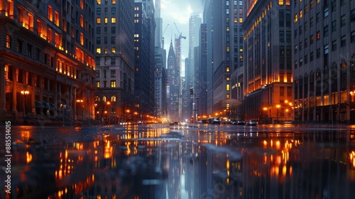 A serene shot of a financial district at dawn, with the first light of day illuminating the buildings, symbolizing new opportunities.