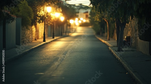 A serene, softly lit street at dusk, inviting calm and tranquility.