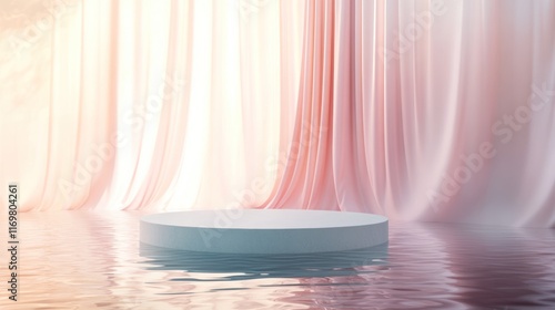 A serene stage surrounded by flowing fabric and water, evoking tranquility.
