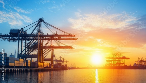 A serene sunset over a bustling port, featuring towering cranes silhouetted against vibrant sky colors reflecting on the water.