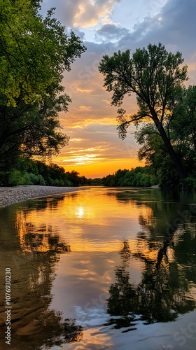 A serene sunset over a calm river, with trees framing the scene. The water reflects the fiery sky, creating a peaceful and tranquil atmosphere.