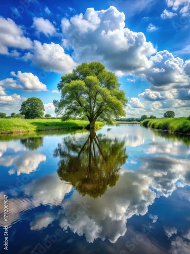 A serene tree reflection in the surface of a crystal clear river with surrounding greenery and fluffy white clouds