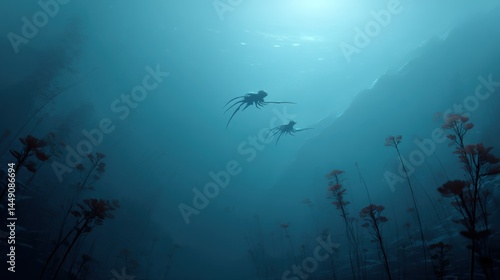 A serene underwater scene depicting two graceful octopuses gliding through a turquoise ocean environment. The water is illuminated by soft light from above, casting a gentle glow on the diverse aquati
