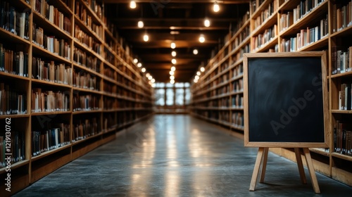 A serene view of a spacious library showcasing tall shelves filled with books, illuminated by warm lights, creating a tranquil study environment for reading and learning.