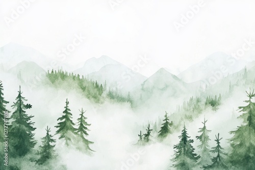 A serene watercolor landscape depicting lush green trees and misty mountains, perfect for conveying tranquility and natural beauty.