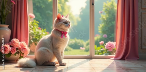 A serene white feline, adorned with a delicate pink bow, sits gracefully by a sunlit window, surrounded by a charming arrangement of pink roses, basking in the warm glow of a summer's day.