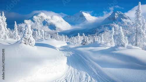 A serene winter landscape featuring snow-covered mountains and trees under a clear blue sky.