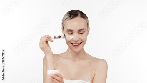 A serene woman gently massages facial cream into her skin, enjoying a peaceful moment during her skincare routine. Ideal for promoting beauty, skincare, cosmetology advertising. Free copy space