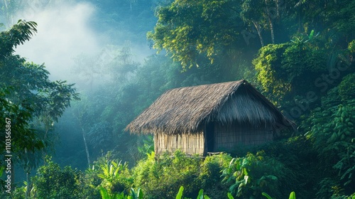 A serene wooden hut nestled in a lush, misty forest.