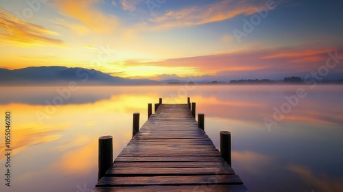 A serene wooden pier stretches toward a colorful sunset over a calm lake, reflecting vibrant hues in the water, creating a peaceful atmosphere.