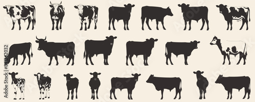 A series of black and white cows in various sizes and positions