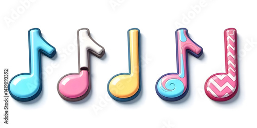 A series of five vibrant, 3d-rendered music note designs with cheerful and playful styles