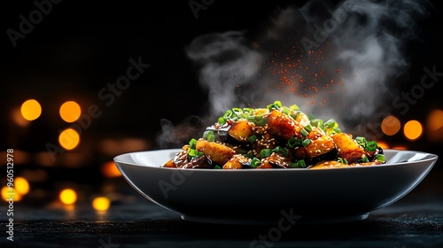 A serving of braised eggplant in garlic sauce, garnished with green onions and sesame seeds, served in a shallow white bowl
