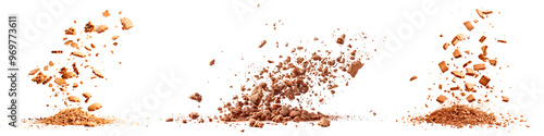 A set of broken chocolate chip cookies and crumbs flying in the air, isolated on a transparent background. Concept of crumbling, texture, and culinary creativity.