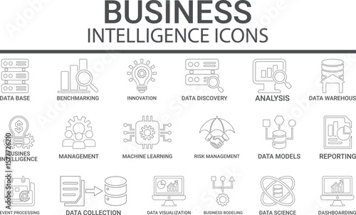 A set of business Intelligence Line art icons, such as benchmark, machine learning, data modeling, and more. Vector illustration. Easily changes to any color.