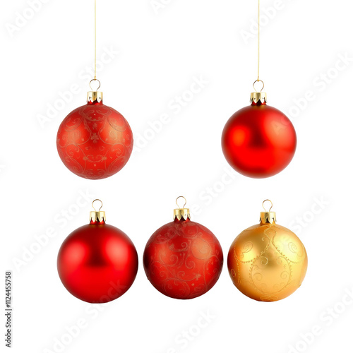A set of colorful Christmas baubles and ornaments in red, gold, and green, isolated on a white (transparent) background.
