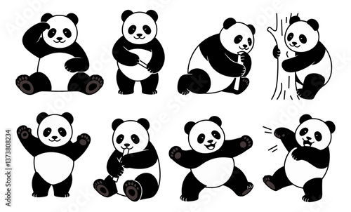 A set of cute panda bears in various poses, including one holding a bamboo stick. Scene is lighthearted and playful, with the bears appearing to be having fun and enjoying themselves