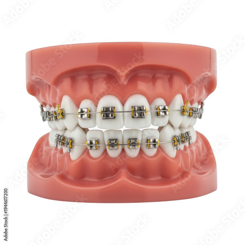 A set of dental braces with metal brackets and wires, isolated on transparent background