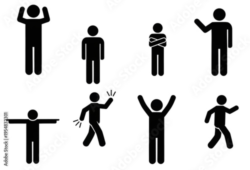 A set of eight stick figures in various poses on a white background