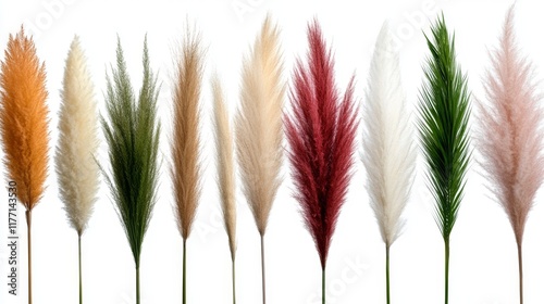 A set of ornamental grass plants, including pampas grass and fountain grass, beautifully isolated on a white background.