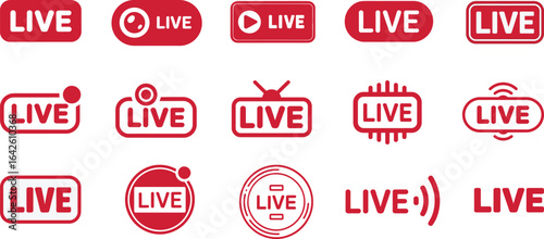 A set of red live streaming icons, broadcast buttons, and symbols for online video and media player vector