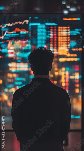 A shadowy figure in front of a screen displaying keyword trends and data.