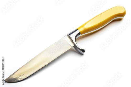 A sharp knife with a bright yellow handle placed on a clean white surface