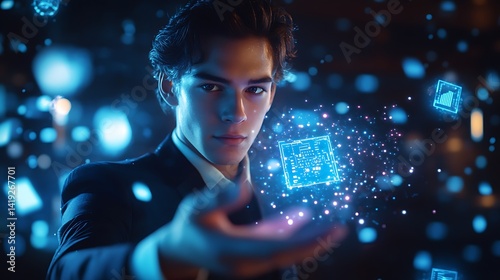 A sharply dressed businessperson in a modern suit extending their hand, a glowing holographic AI chip hovering above the palm, surrounded by translucent floating icons representing marketing, sales,