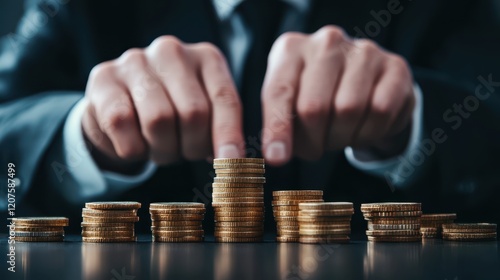 A sharply dressed man in a sleek suit meticulously stacks shimmering coins, creating a growing tower of wealth and ambition amidst a soft, blurred backdrop.