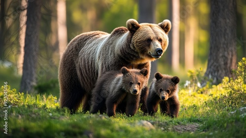 A she-bear and her cubs are seen in a summer pine forest, showcasing their natural habitat during the warm season.