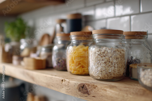 A shelf with many jars of food, including oatmeal and yellow pasta
