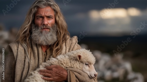 A shepherd holding a found sheep on a rocky cliff at golden hour with sunlight breaking through clouds.
