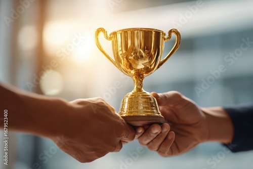 A shiny golden trophy being passed between two hands, symbolizing achievement and success in a competitive environment with teamwork and collaboration.
