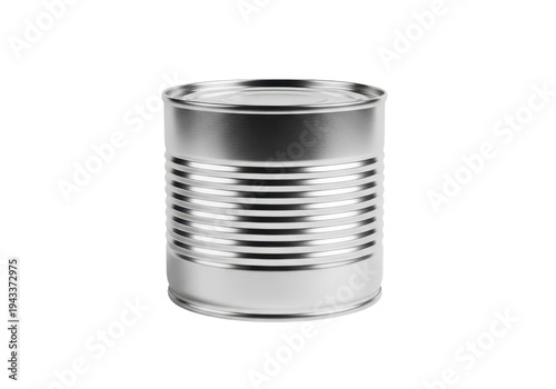 A shiny metal tin can with a ribbed body and smooth top and bottom isolated on transparent background