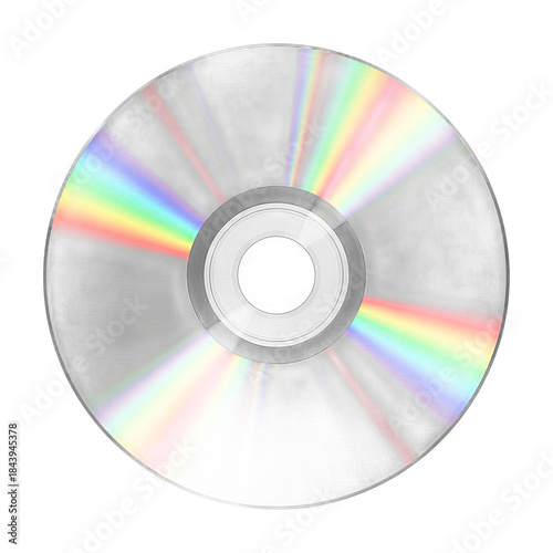 A shiny silver CD with colorful rainbow light reflections on a white background