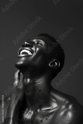 A shirtless African male dancer covered with oil and glitter for a performance. His face is lit up with joy.