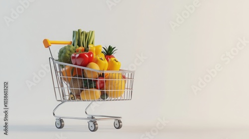 A shopping cart filled with various fresh fruits and vegetables.