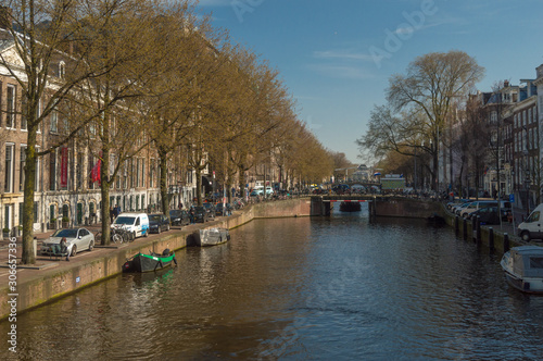 A shot of the canal in Amsterdam, Netherlands, from a bridge in the city in the Winter.