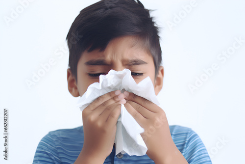 a sick little boy is blowing his nose and covering it with a handkerchief