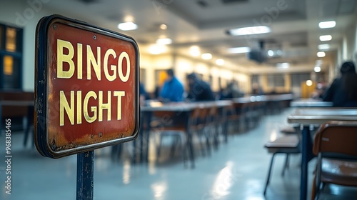 A sign that reads “BINGO NIGHT’ - blurred background of cafeteria where people are playing bingo - game night