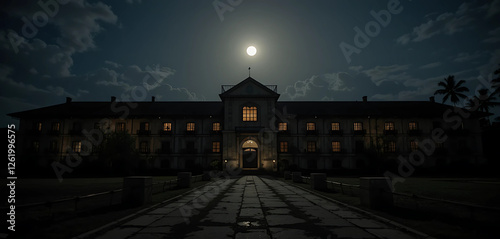 A silent night at the Cellular Jail in Port Blair, where the soft glow of the moon creates a hauntingly beautiful scene.