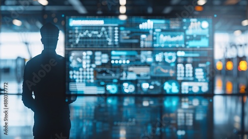 A silhouette of a logistics manager stands before a futuristic digital interface displaying various technological innovations in logistics, with ample copy space to the side.