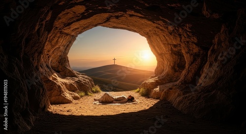 A silhouette of a lone person lying on the ground inside a dark cave looking out at the sunset