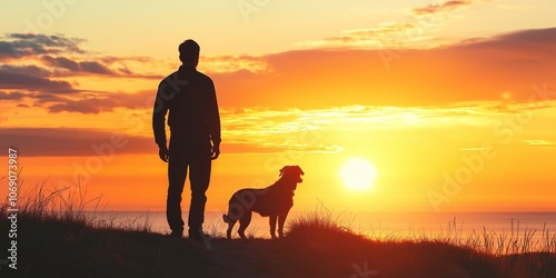 A silhouette of a man and his dog watching the serene sunset together, evoking companionship and tranquility.
