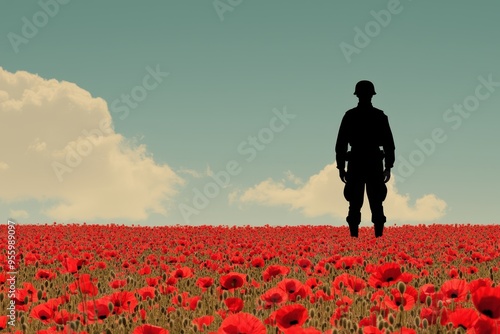 A silhouette of a military soldier standing in a field of poppies. Remembrance day